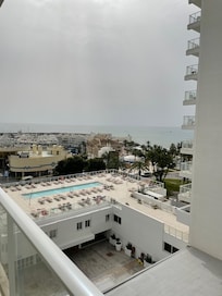 The room I stayed in was a bit tired, with paint missing on the bottom of the door. The air conditioning also was very poor and luckily, as it wasn't that warm outside, it made more sense to have the balcony doors open to make the room cool, rather than having the A/C on. Apart from that, the room was comfy enough, with a fridge and plenty of cupboard space and a safe. There was no kettle on the room but I asked for one from reception and got one brought by the comfort team, The balcony was big enough, but looked over the road outside the hotel, although you could see the sea from it. There are plenty of sun loungers at the different pools, but the pool bar wasn't open as not really warm enough a lot of the time to sit outside. Breakfast was very nice, with good choice and topped up often even though very busy most times. Didn't have the evening meal but some of my friends had it on one of the nights and said it was very good value.