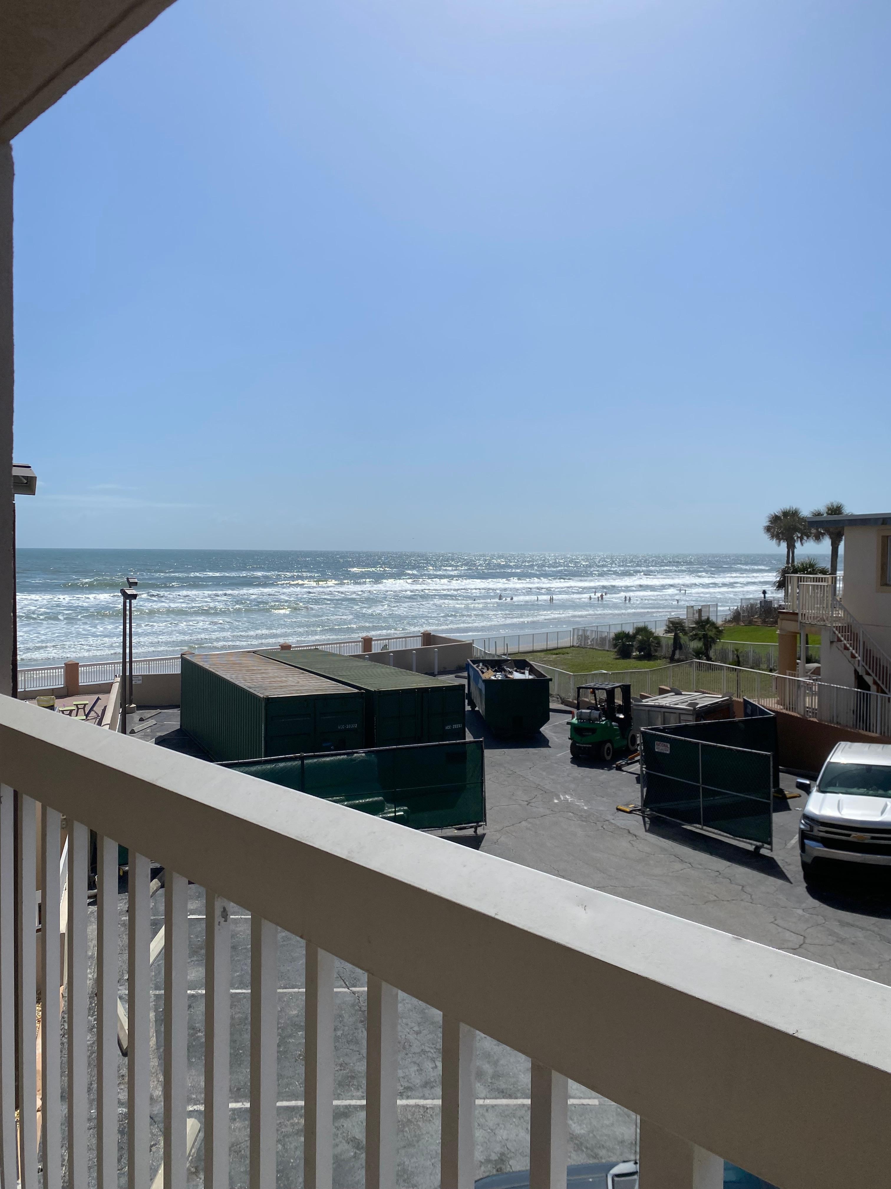 Room had an ocean view. Our only huge complaint was we rent two rooms for Bike Week, yet bikes were welcome but no parking was reserved for bikes as at every other hotel we’ve stayed at previously for Bike rallies. That was a huge disappointment as we were having to fight with limited parking in general then trying to maneuver the bikes in and out of the crowded car filled parking lot. One night our bikes with a few others only had parking available UNDER the balconies and we woke up to several spits on one bike and ashes on another! Also, there was no trailer parking on site which wasn’t specifically noted in the online description of hotel. The staff was all very friendly and breakfast was well. The beds were comfortable which was a huge plus. You can tell hotel is dated but didn’t expect much more it being right on the ocean.