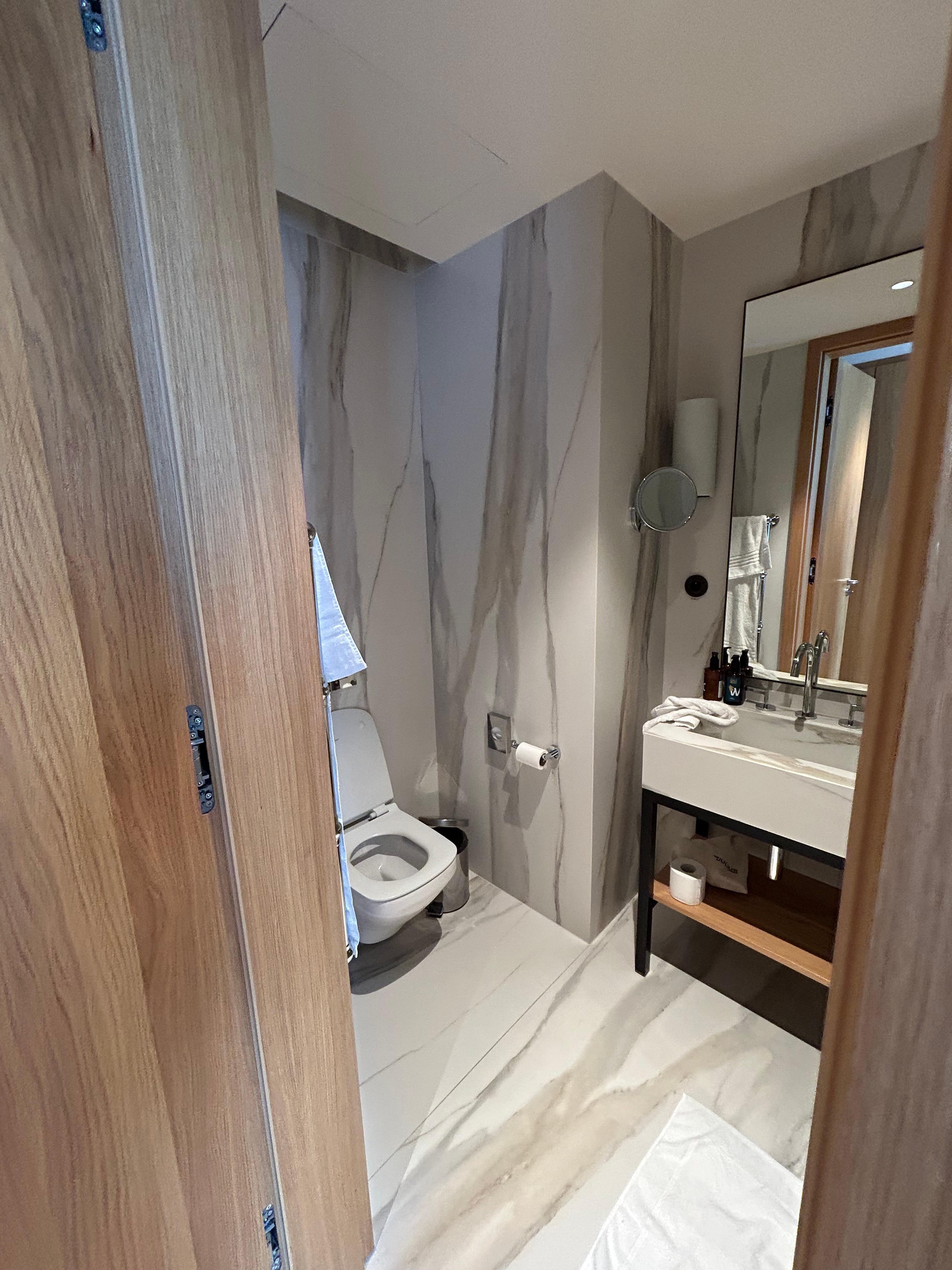 Phòng tắm với sàn nhà có sưởi và đồ dùng nhà tắm được thiết kế riêng