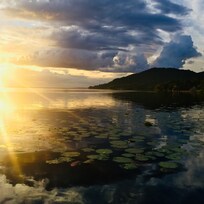 Travelers find beautiful lakeside surroundings perfect for relaxation before enjoying a satisfying meal at the on-site restaurant