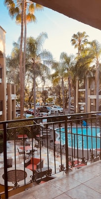 Yes, this property has an outdoor pool. Pool access is from 9:00 AM to 10:00 PM.