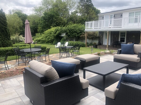 Guests sip coffee near the garden's peaceful atmosphere or gather around a cozy firepit beneath a star-filled sky at this charming historic inn