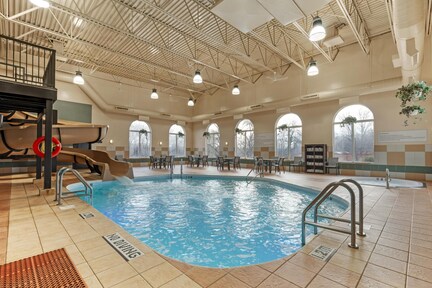 Guests start their day with a complimentary breakfast buffet before heading to the indoor pool with waterslide or unwinding in the spa tub
